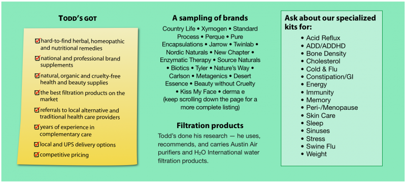 Please ask! From vitamins to health and beauty care, Todd can very likely get you a better deal on the professional and national brands you currently drive all over town to buy. To get started, simply e-mail him the list* of products you use, or call, to find out how much you could be saving.